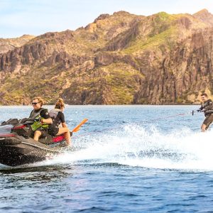 - Wide rear deck with multi-step boarding ladder